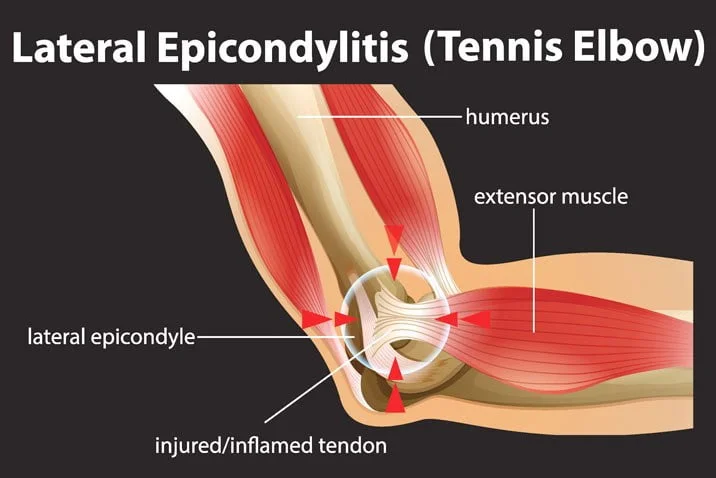Tennis elbow, medically known as lateral epicondylitis, is a painful condition caused by overuse or degeneration of the extensor tendons that attach to the lateral epicondyle — the bony bump on the outside of the elbow. The condition ranges from tendonitis (inflammation) to tendinosis (degenerative changes and microtears) and can cause weakness, pain with gripping, and difficulty with wrist extension. NCBI+1